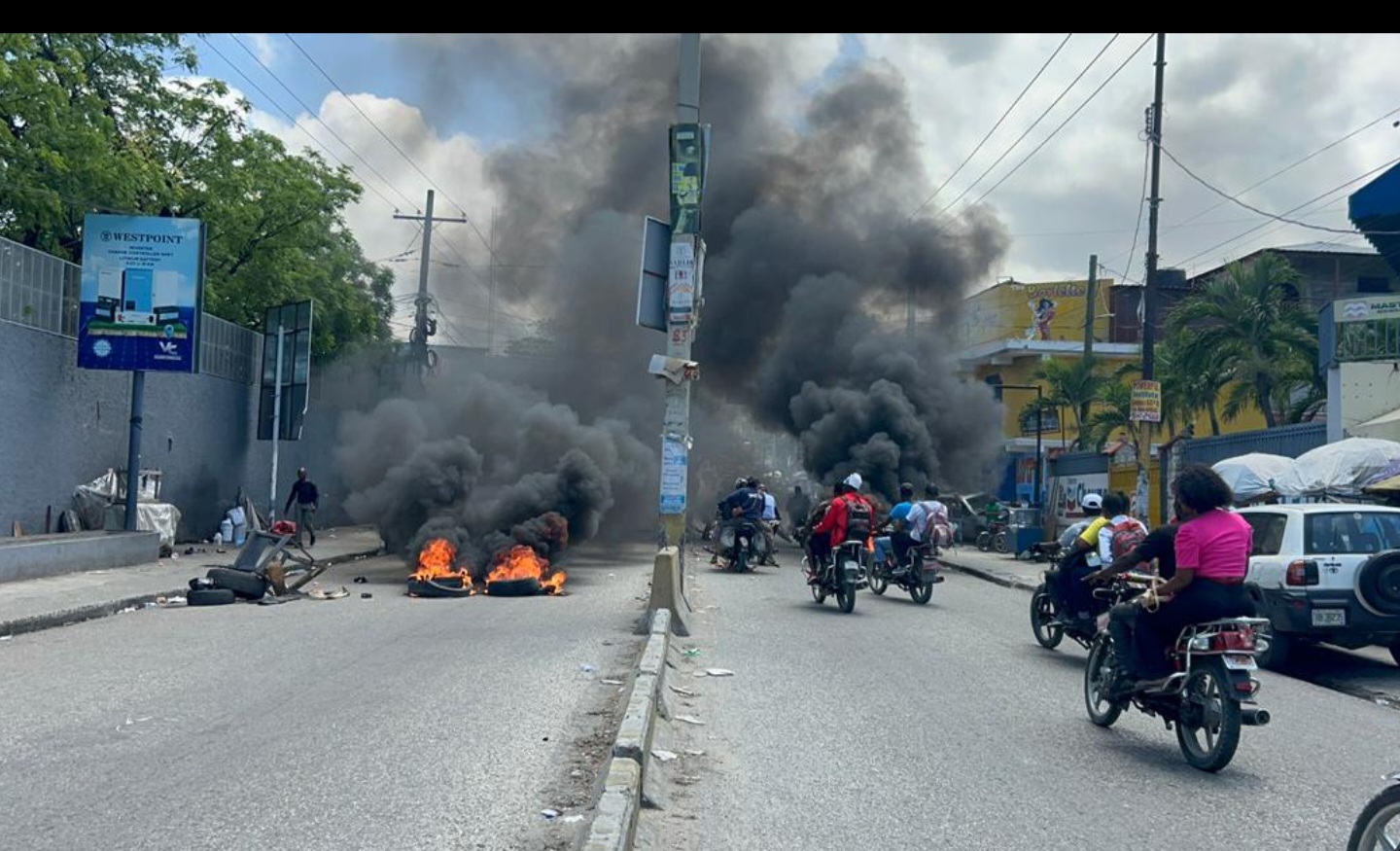 Des barricades de pneus enflammés ont également été entreposées sur la voie publique à Delmas 48 et à Delmas 40B. La Police nationale d’Haïti (PNH) a fait usage de gaz lacrymogène pour disperser la foule. La circulation reste fortement paralysée dans cette zone.